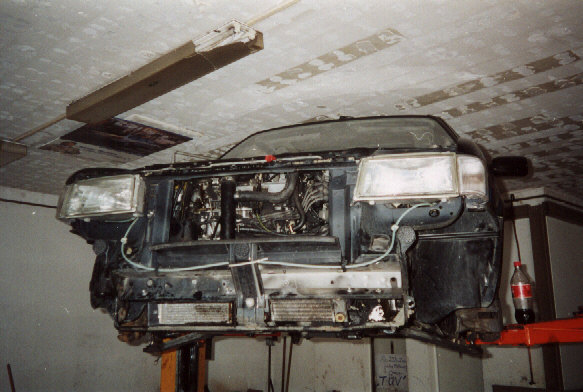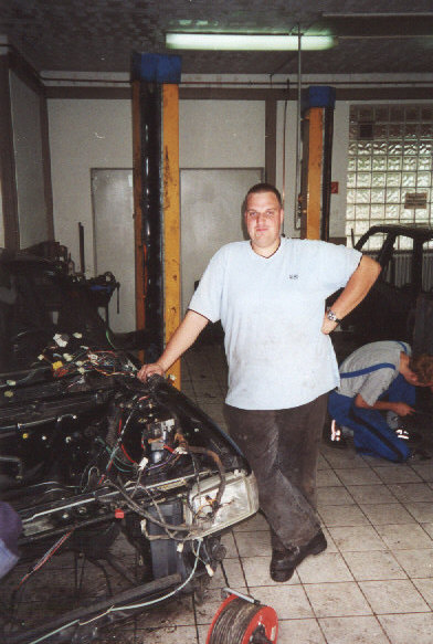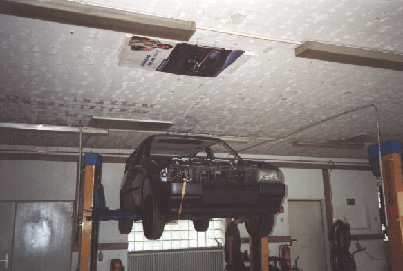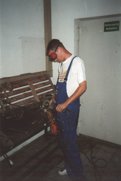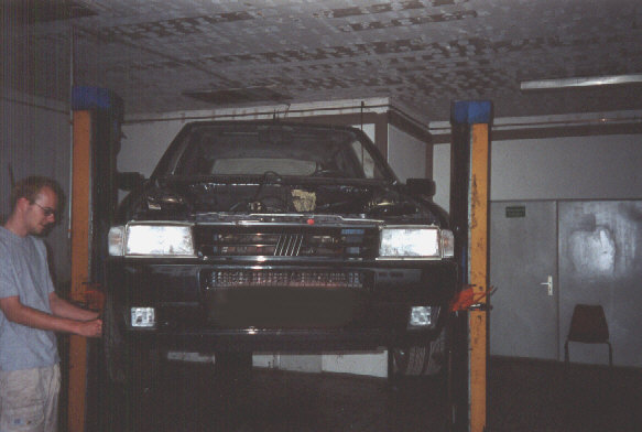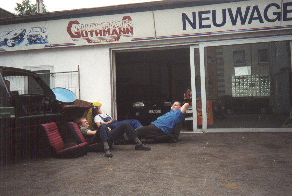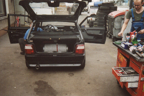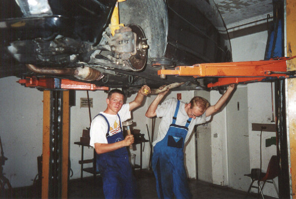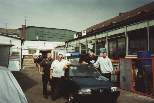 Nach einer durchzechten Nacht ging die Schrauberei am folgenden Montag um ca. 9.00 Uhr los. Das unschlagbare Team Fiatschrauber, Opelschrauber, Killer und Herbe Turbo begab sich an sein Werk. |