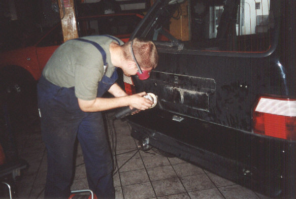 Der Opelschrauber bei der Vorbereitung zum Zuschweißen aller Löcher in der Heckklappe. | ||